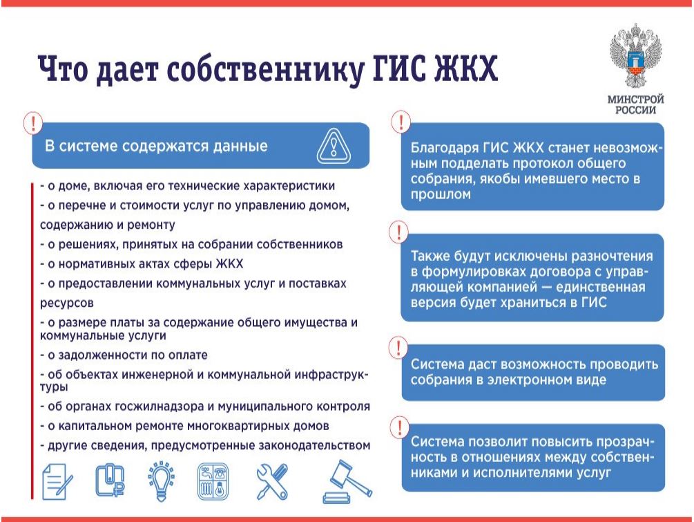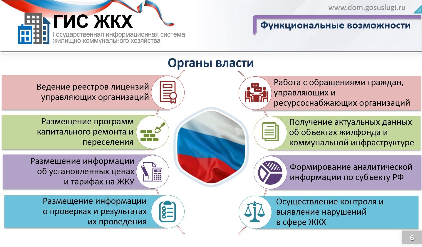 ГИС ЖКХ — это единый ресурс, где собираются данные о состоянии ЖКХ со всей страны и всех участников рынка: через ГИС ЖКХ россияне могут взаимодействовать с управляющими и ресурсоснабжающимиорганизациями, ТСЖ, органами власти различных уровней.