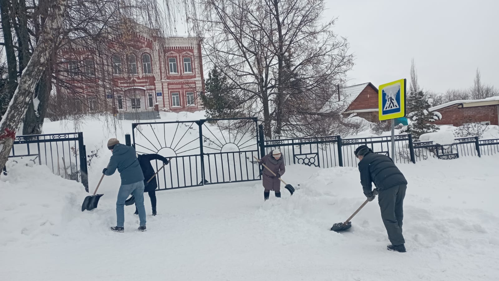 11 февраля дружной командой в составе 10 человек учителя школы взялись за работу по уборке прилегающей территории от снега.